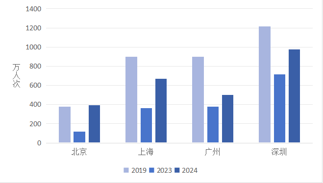 图2 北上广深四个城市2019、2023和2024年入境游客接待情况