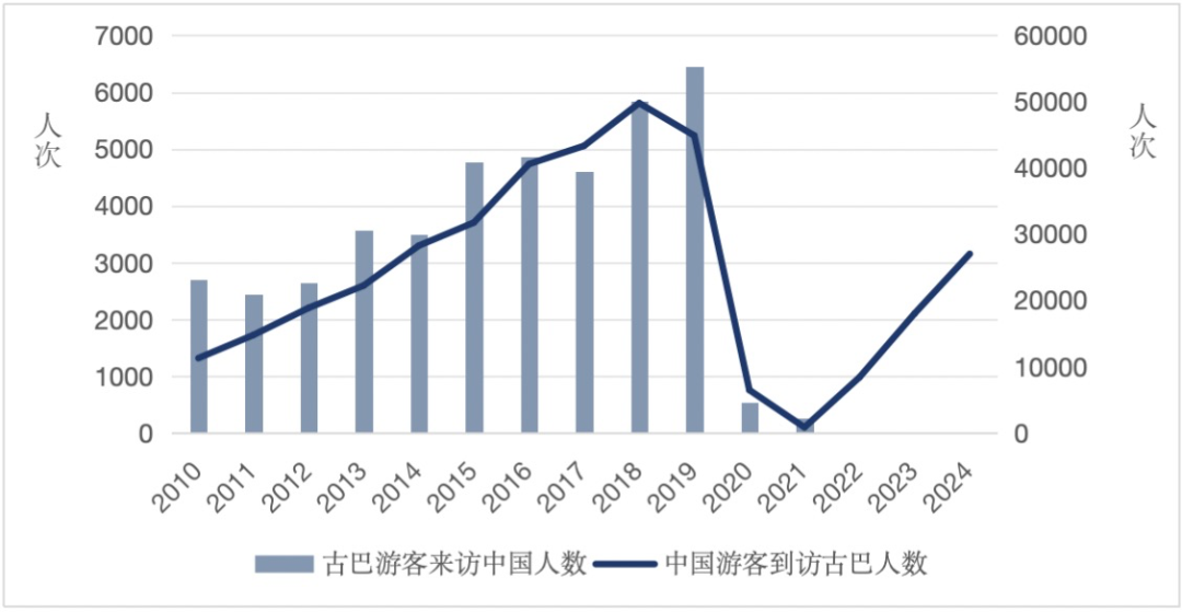2010-2019年间,中国与古巴双向研讨保持稳定增长态势,其中古巴来华旅游人数年均增长达10.1%。2024年,随着古巴宣布对中国持普通护照公民实行免签政策及中古直航恢复,当年赴古巴的中国游客达2.7万人次,同比增长48.6%。2025年第一季度(截至3月25日),共有6542名中国游客抵达古巴,同比增长21.0%。