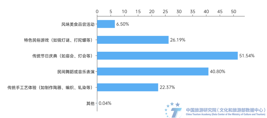 古镇民俗文化活动是文旅融合的重要载体。古镇为游客给予了活动空间,而古镇内民俗活动、民间舞蹈和音乐等则为游客的个人情绪调动和情感共鸣给予可能。调查显示,92.77%的受访者愿意参与当地民俗活动,其中传统节日庆典是最受欢迎的古镇民俗活动,占比达51.54%。其次是民间舞蹈或音乐表演,占比为40.8%。传统手工艺体验和特色民俗游戏分别占比为22.37%和26.19%。此外,对于古镇民俗活动的可参与性,超过半数的受访者认为较好或非常好,有一定的活动供游客参与,活动丰富多样,游客参与度高。
